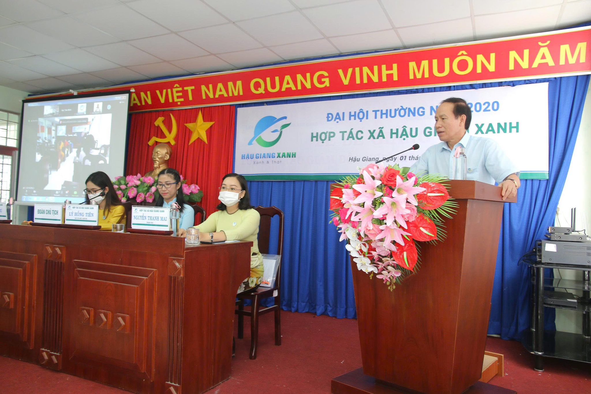 Ông Lê Tiến Châu phát biểu tại Đại hội Hợp tác xã Hậu Giang Xanh, thể hiện sự quan tâm đến phát triển kinh tế tập thể.